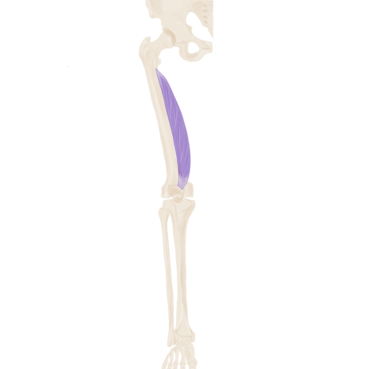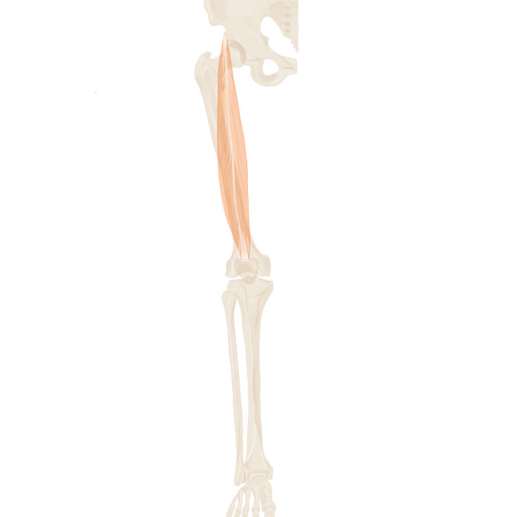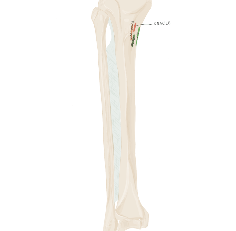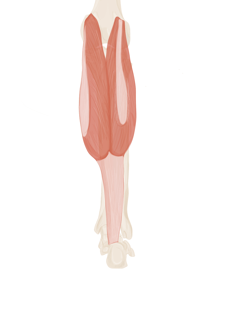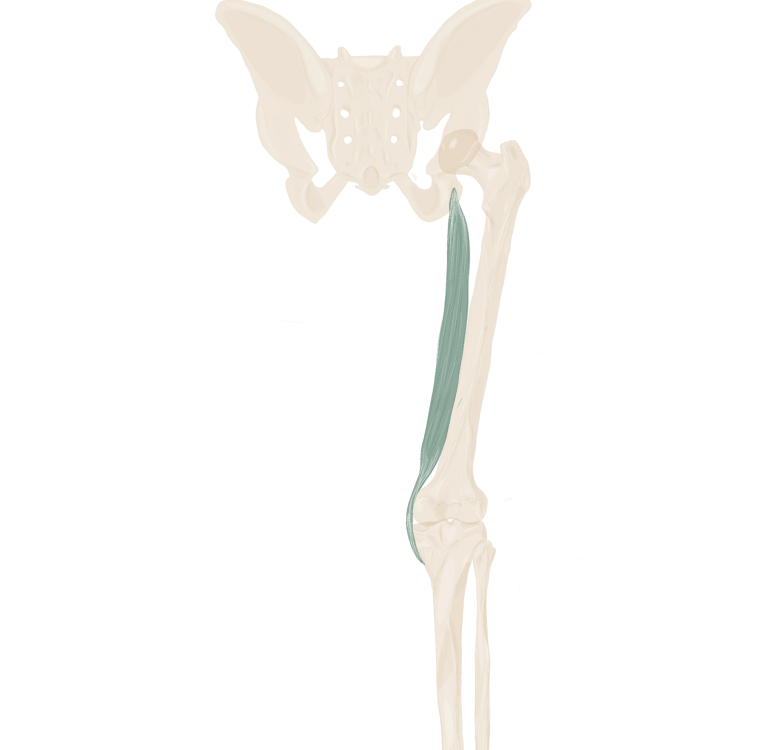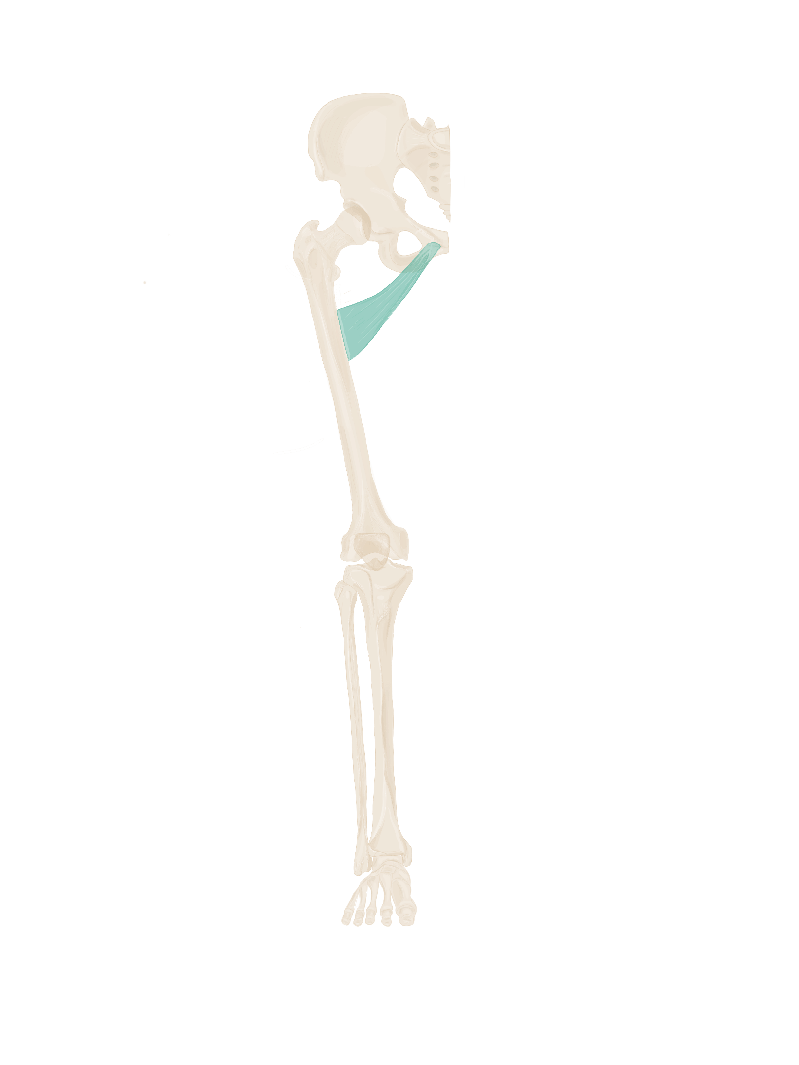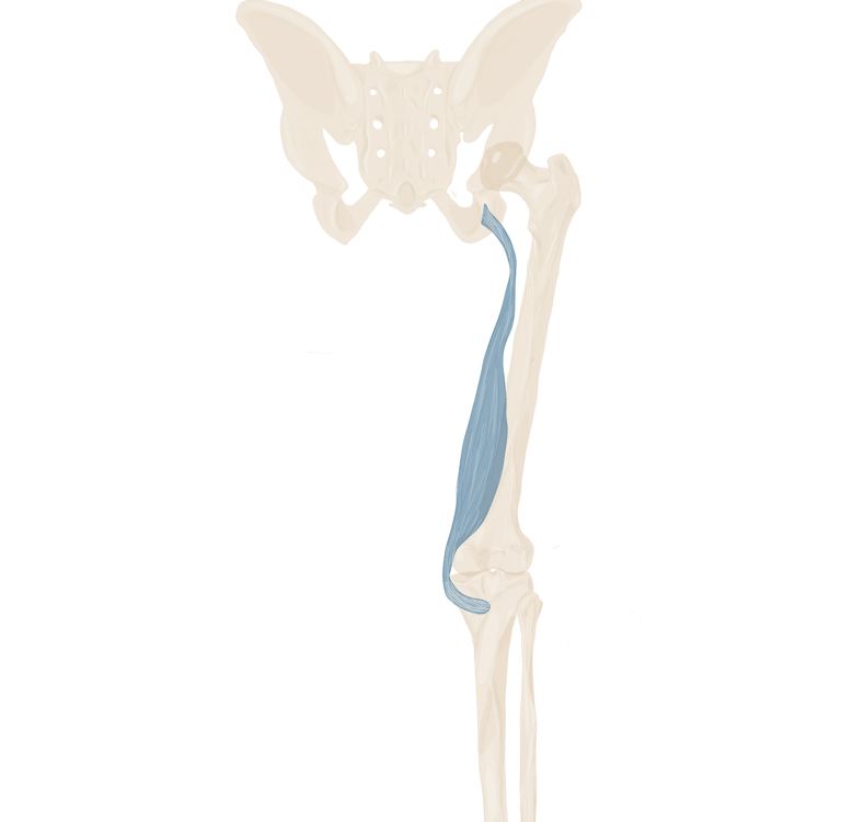 A ce niveau, il sera accompagné à son bord supérieur par le muscle jumeau supérieur et à son bord inférieur par le muscle jumeau inférieur.