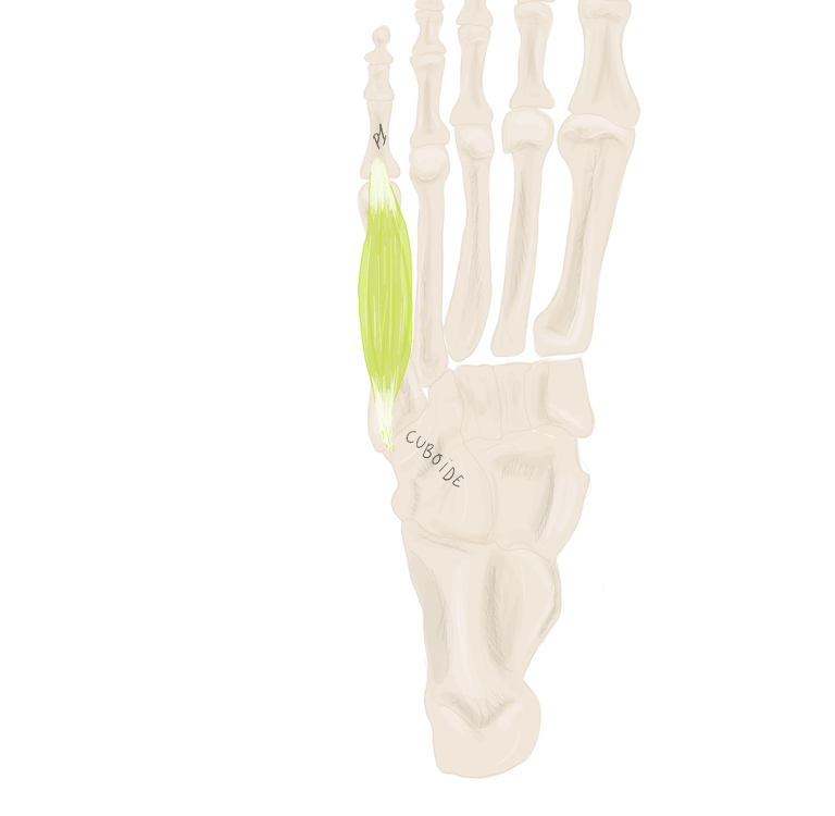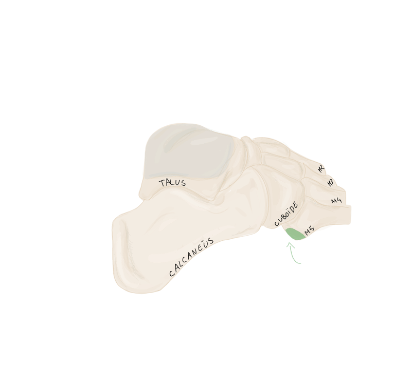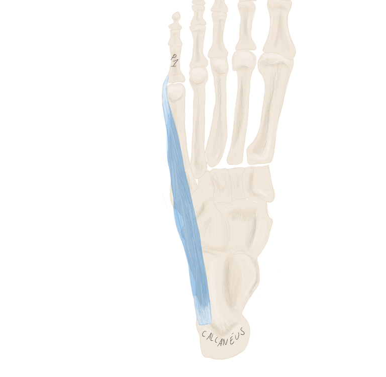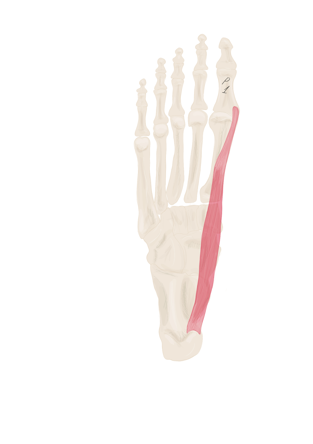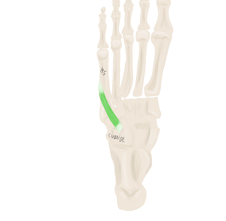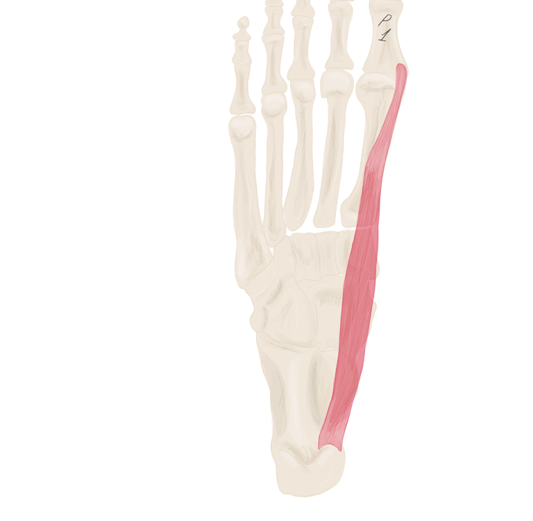 Sur la face périphérique de P1 la plus éloignée de l’axe du pied. Se termine sur P1 du 3, 4 et 5.