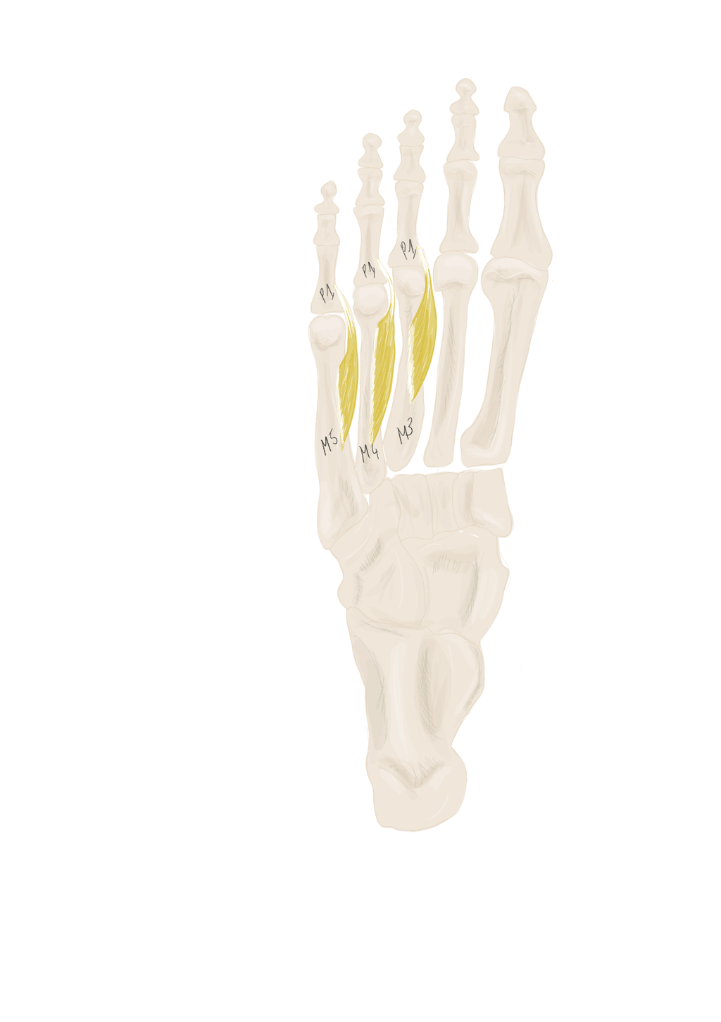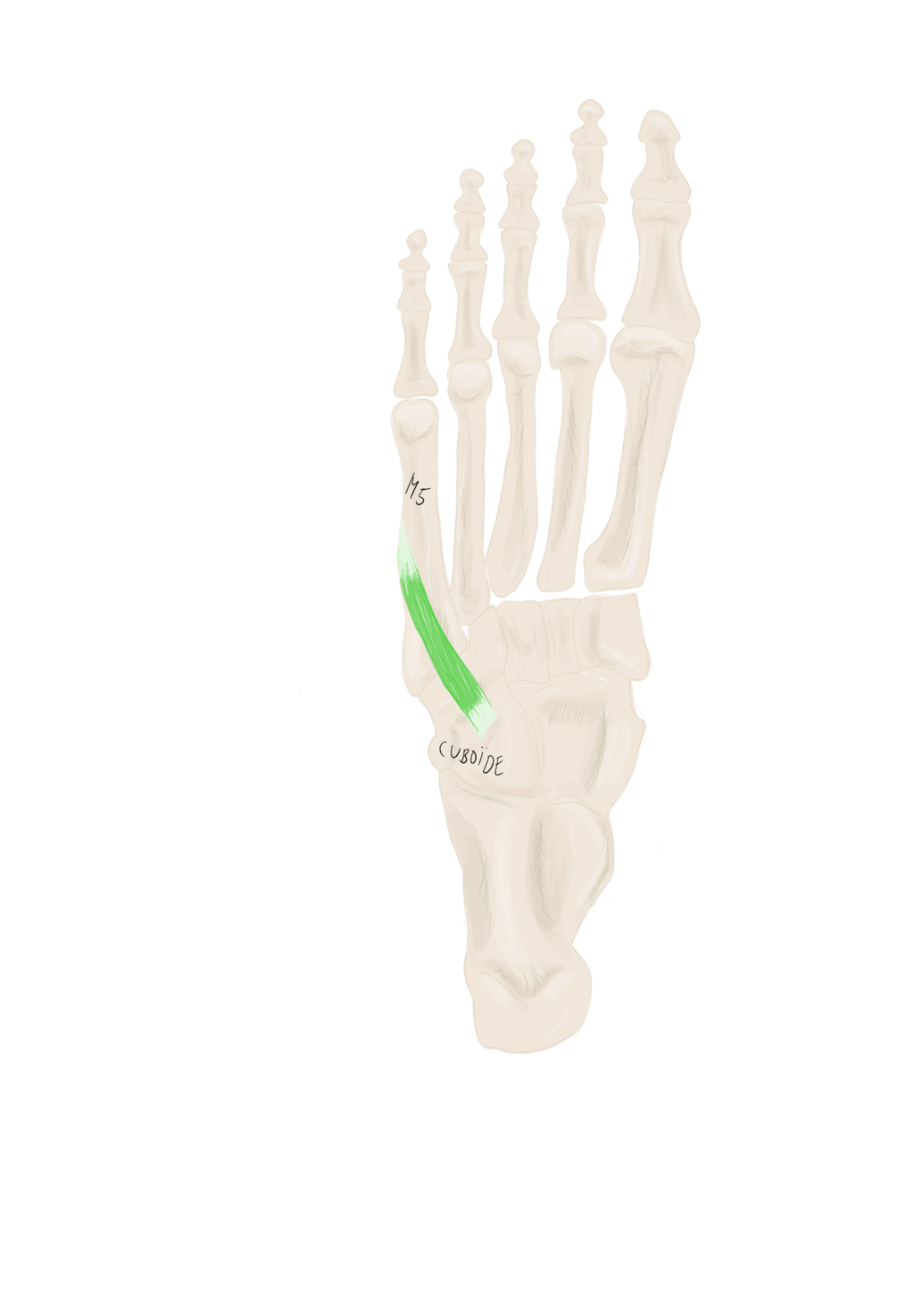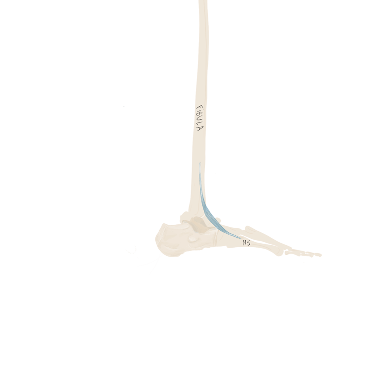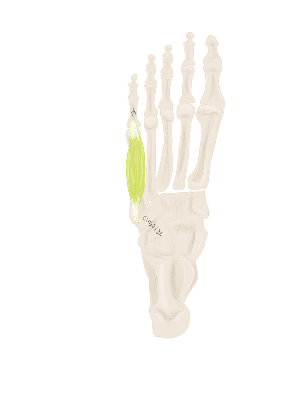 Sur la face périphérique de P1 la plus éloignée de l’axe du pied. Se termine sur P1 du 3, 4 et 5.