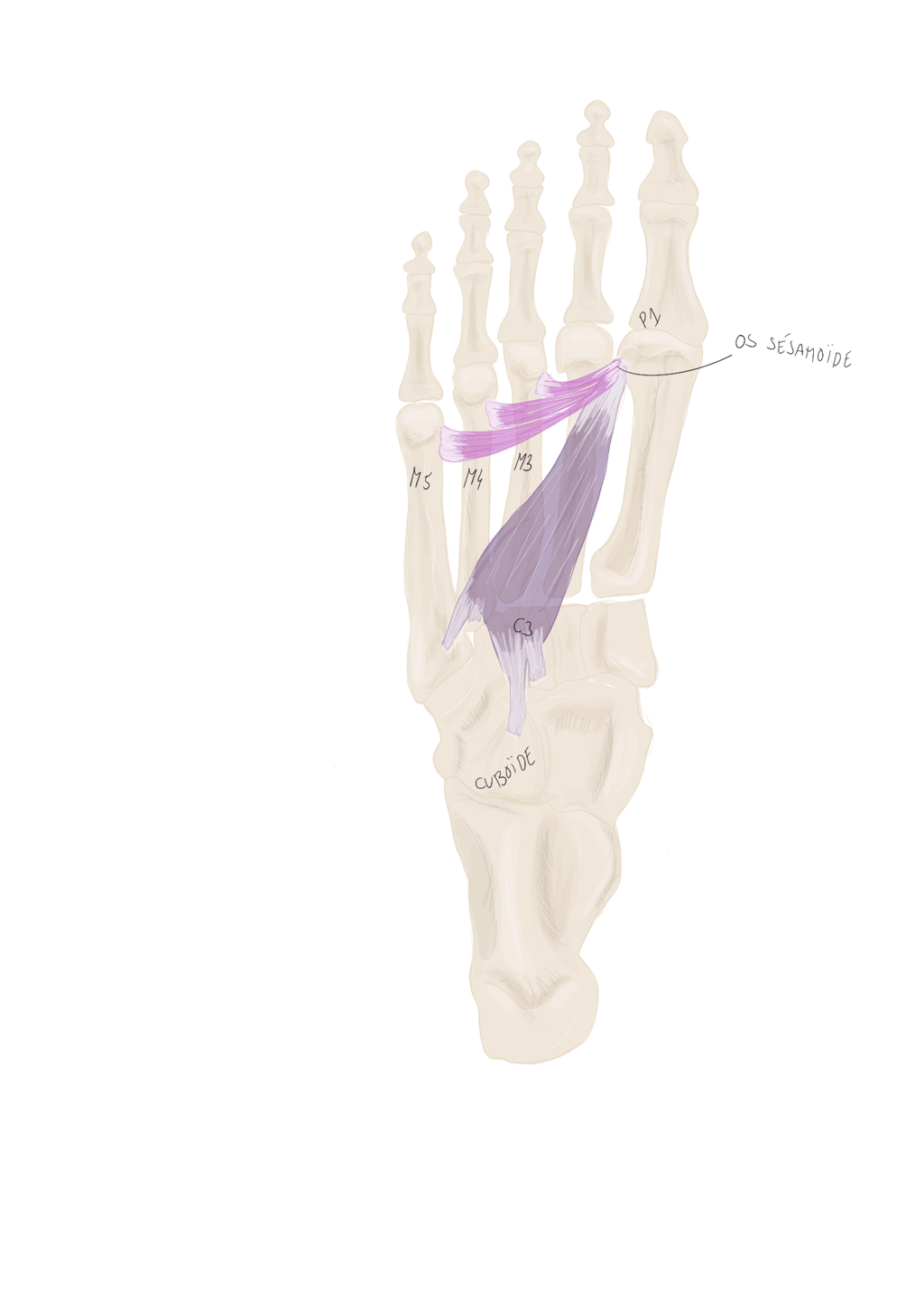 A la partie moyenne de M1, il se divise en 2 tendons pour laisser passer le long fléchisseur de l’hallux.