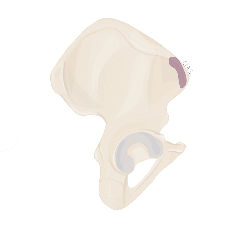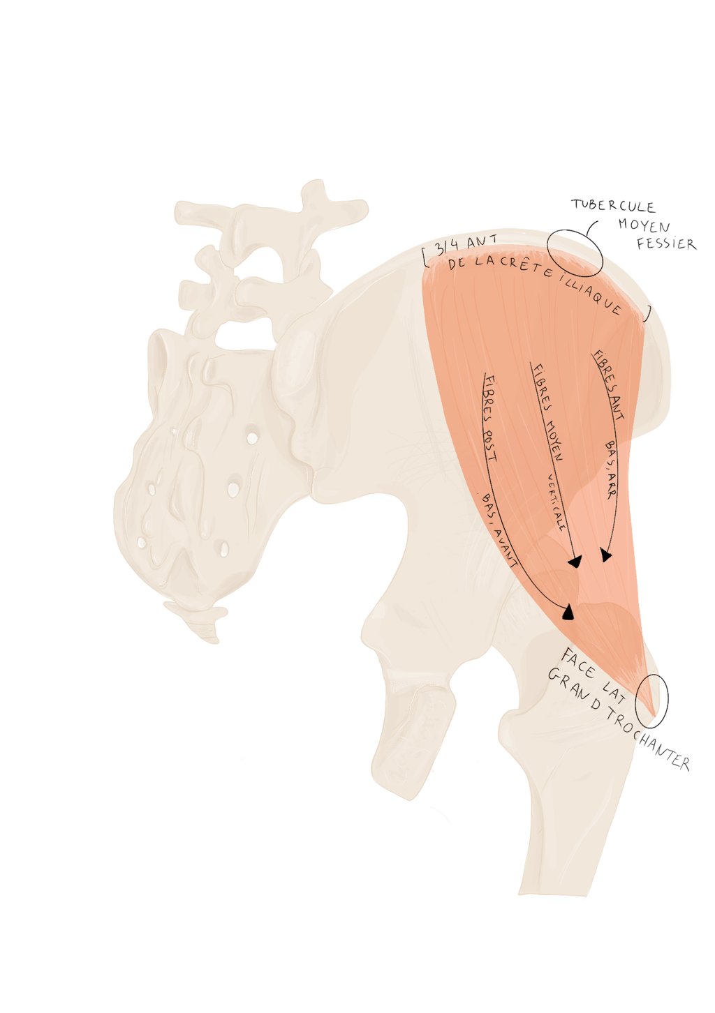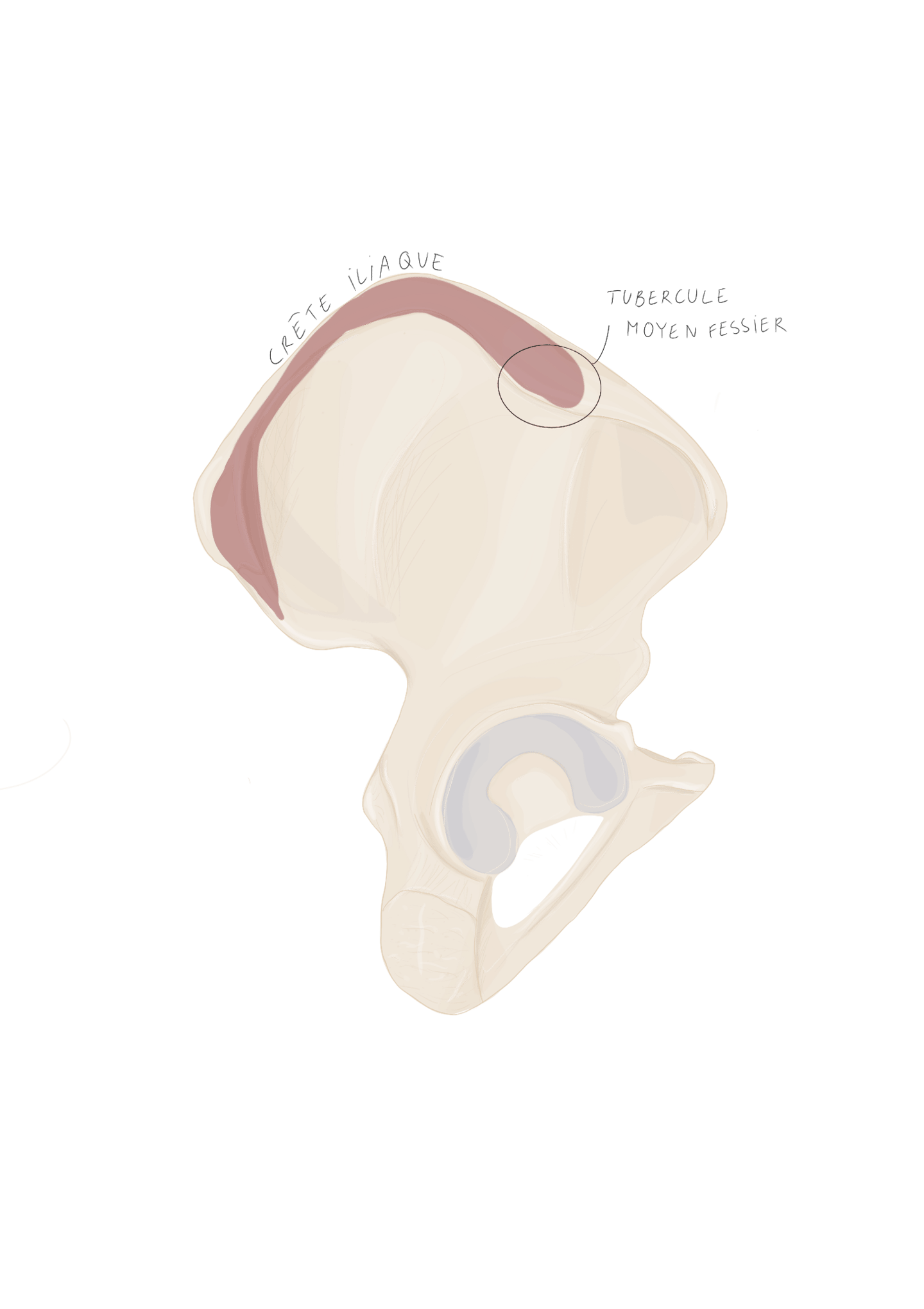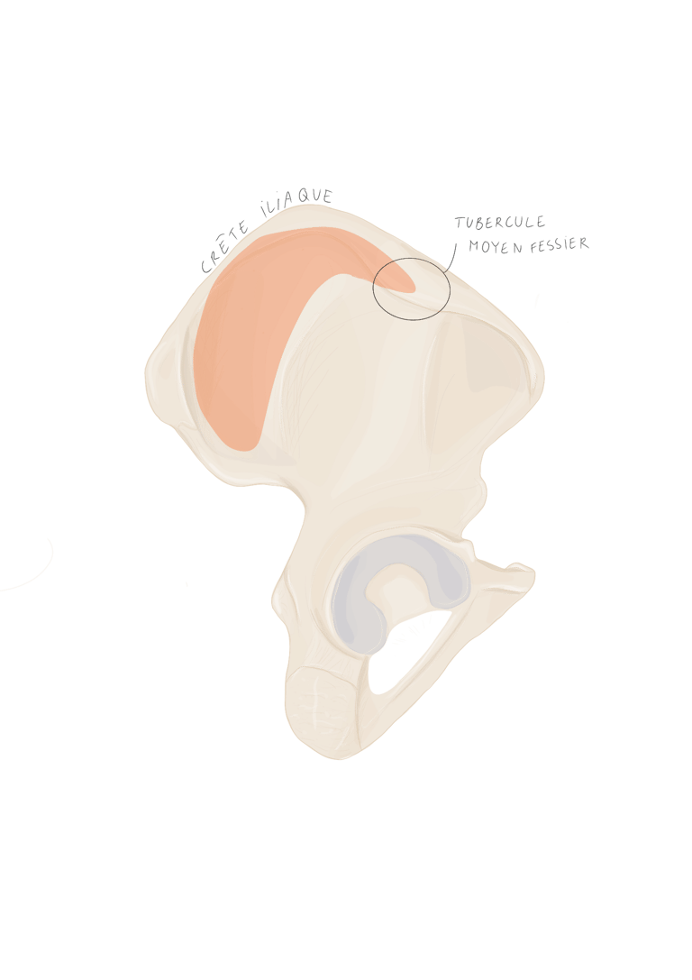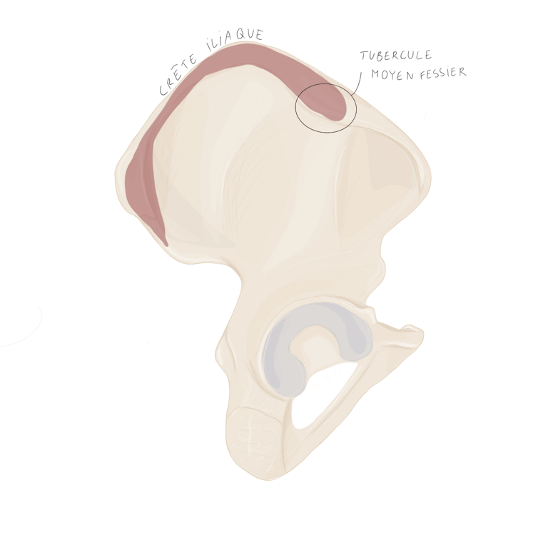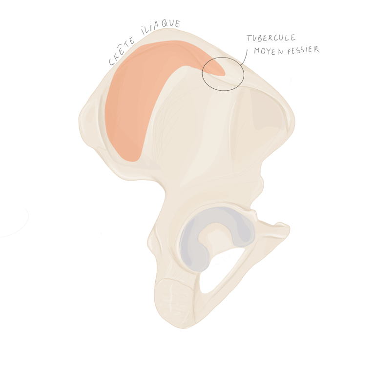les ¾ antérieurs de la crête iliaque et notamment sur le tubercule du moyen fessier