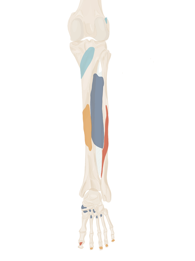 Sur la face médiale de la base de P1 des 4 derniers orteils + expansions aux tendons du long extenseur des orteils correspondant.
