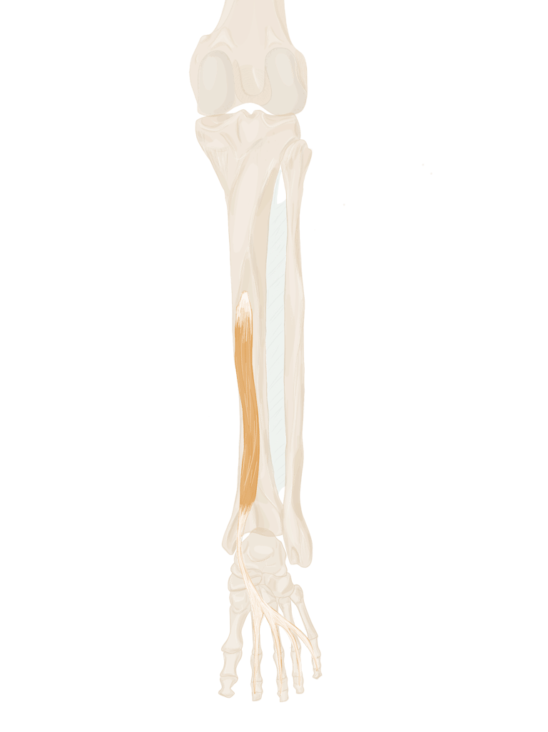 A la partie moyenne du pied, il se divise en 4 tendons.