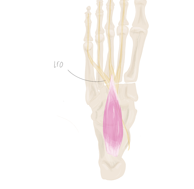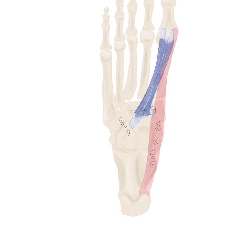 En dedans de lui se trouve l’adducteur oblique de l’hallux et en dehors de lui se trouve l’opposant du 5.