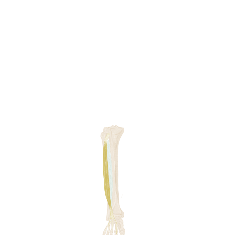 Il se continue par un tendon qui se situe en dedans de l’articulation métatarso-phalangienne des 4 derniers orteils.