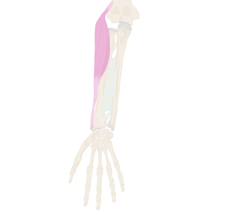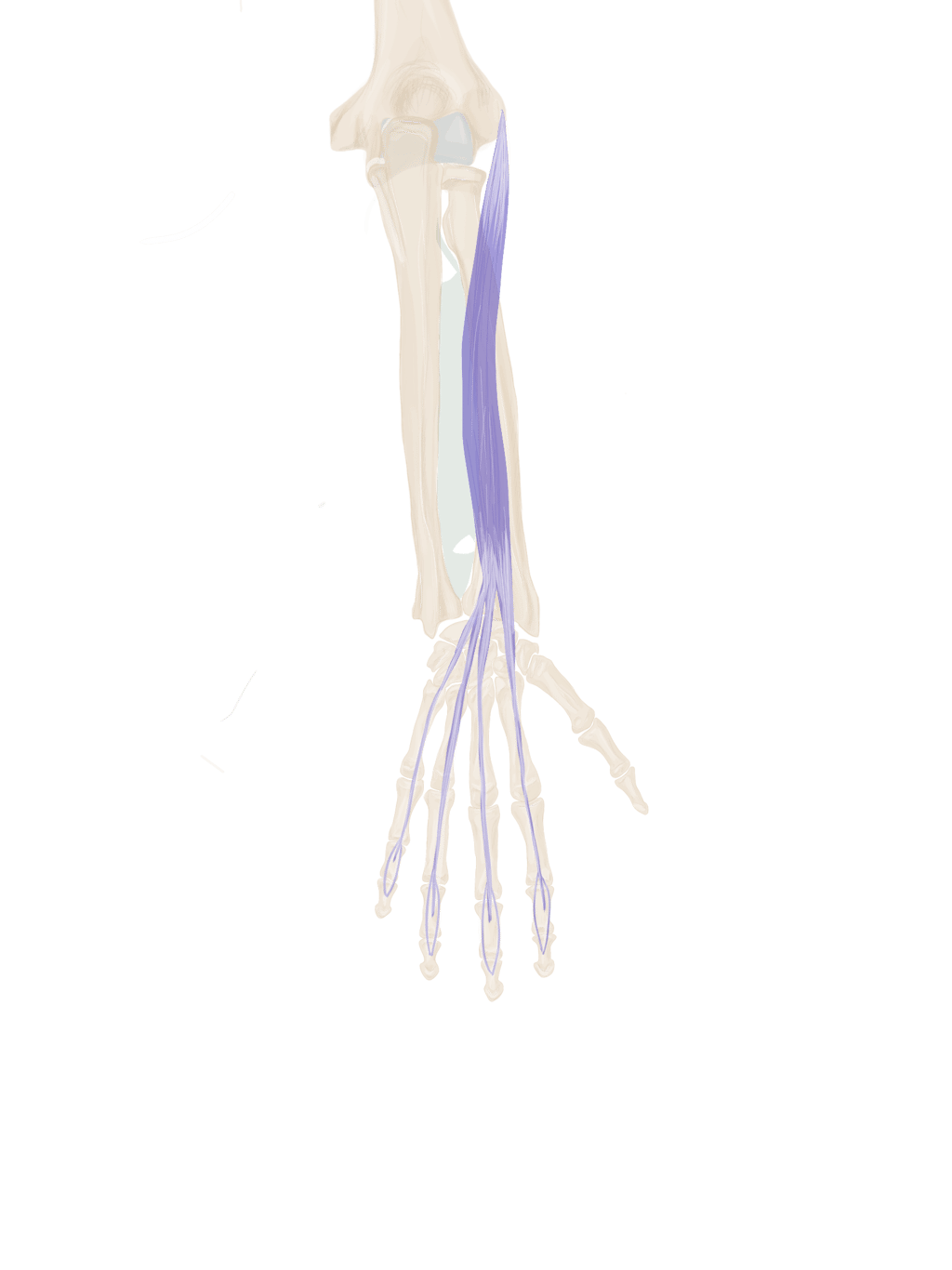 Extenseur du poignet et participe à l’inclinaison radiale (abd), stabilisateur du coude, effet ténodèse