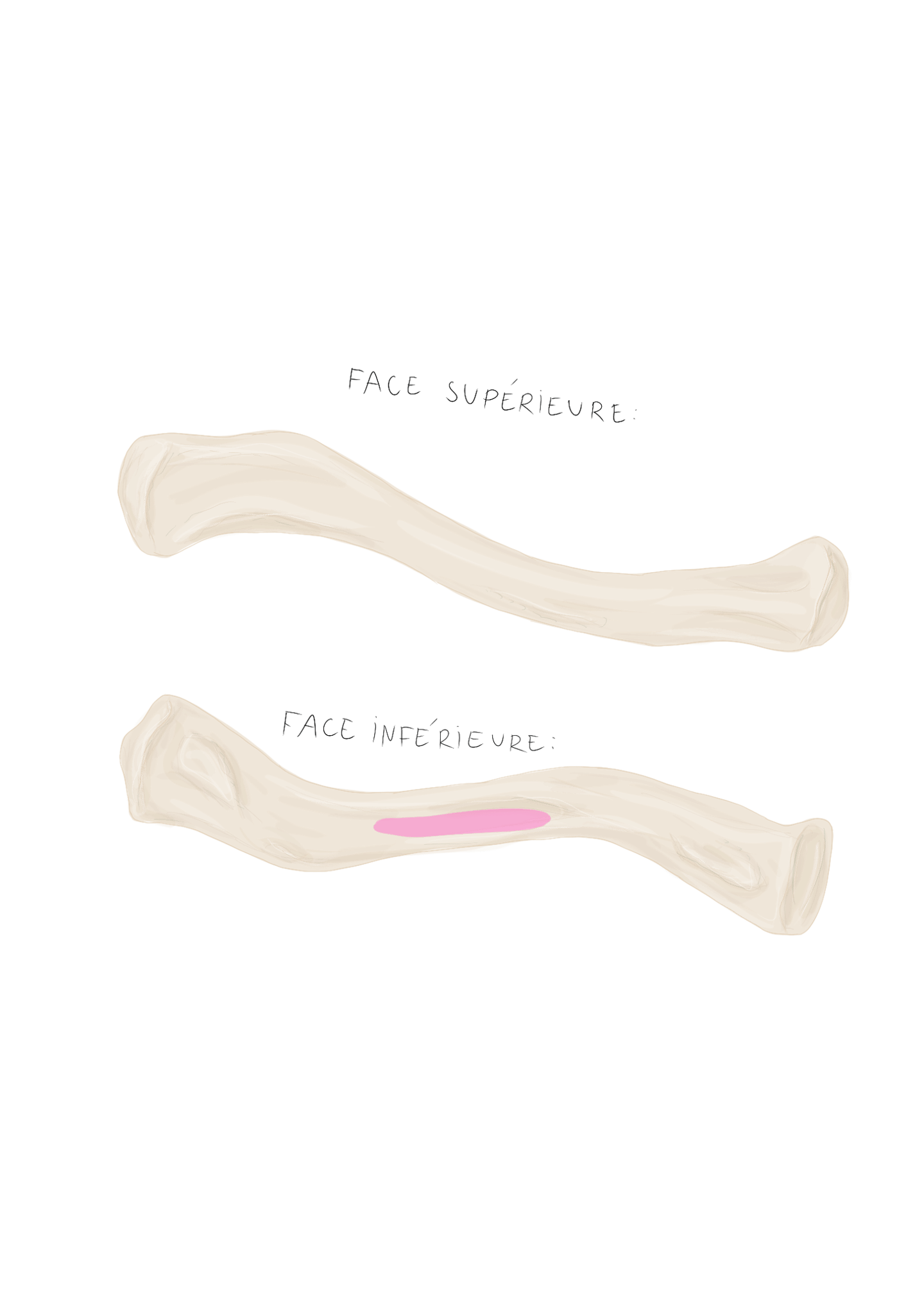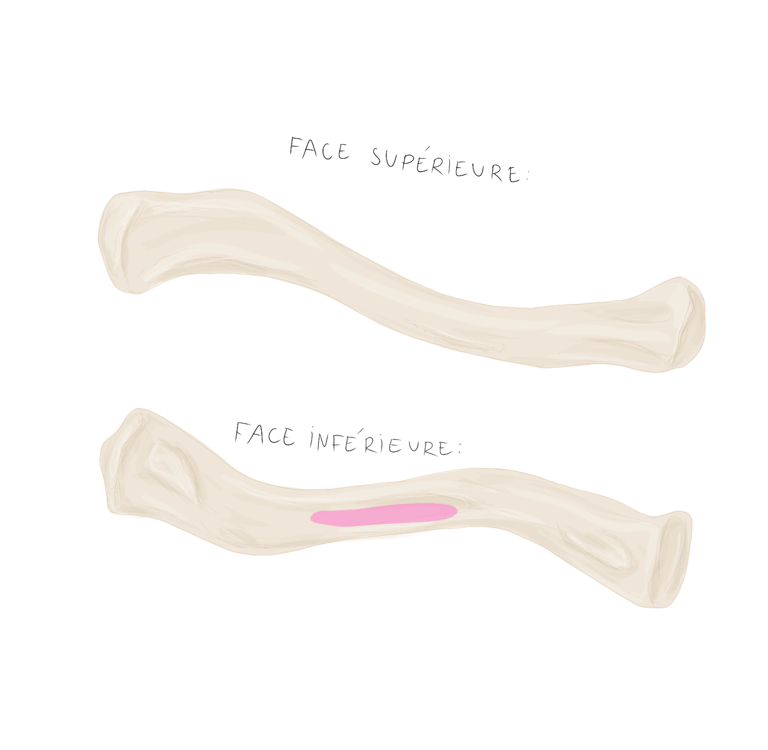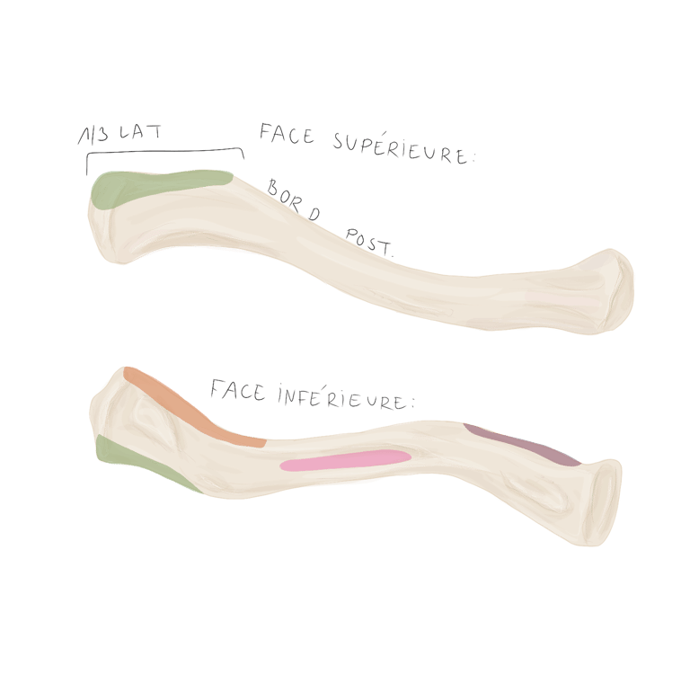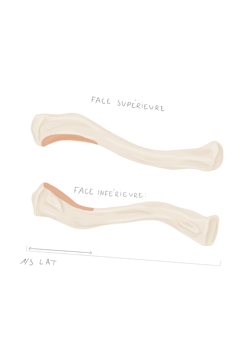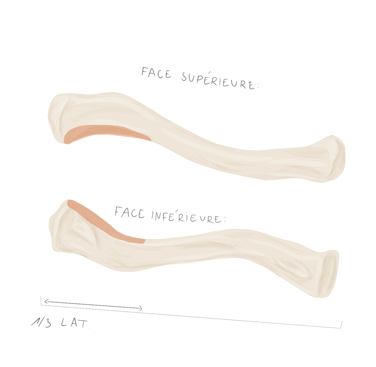 En dedans, sur une ligne courbe à concavité latérale sur les 2/3 ant. de la clavicule