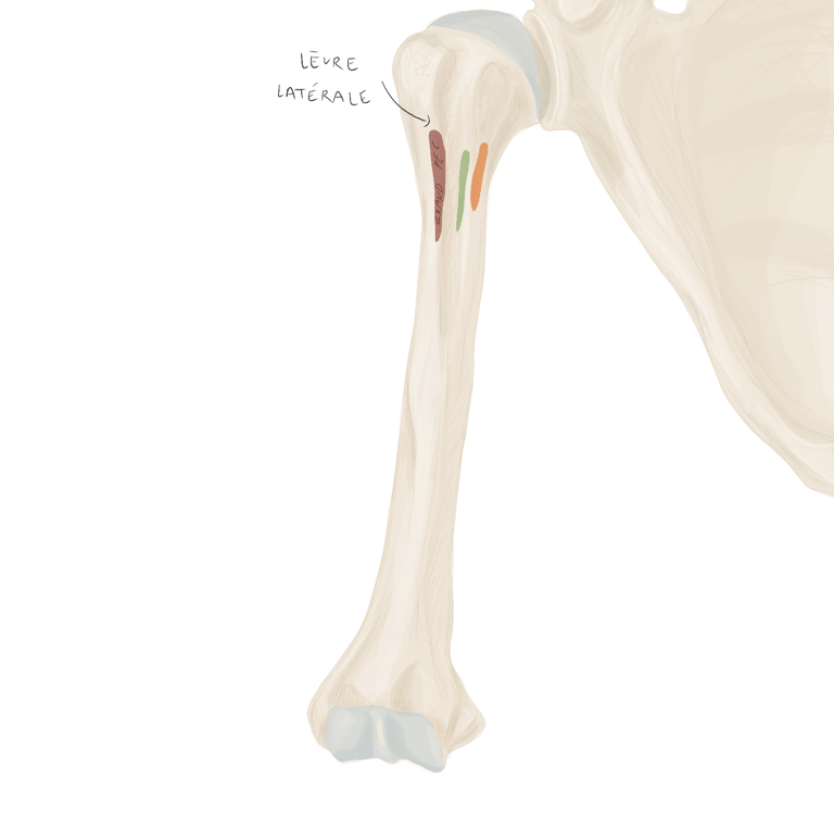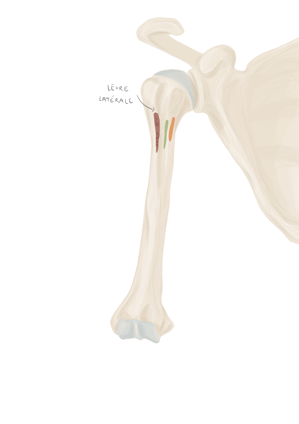 Sur la lèvre inférieure du bord inférieur de la scapula et sur la lame d’insertion tendineuse du deltoïde.