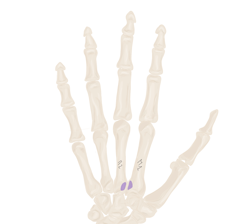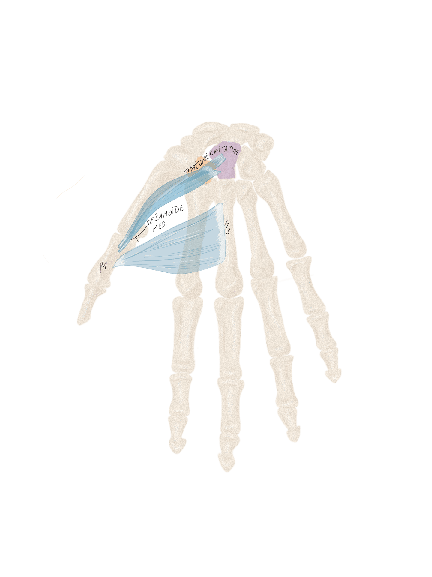 Latéralement sur la base de P1 et sésamoïde latéral et le système extenseur du pouce comme un interosseux