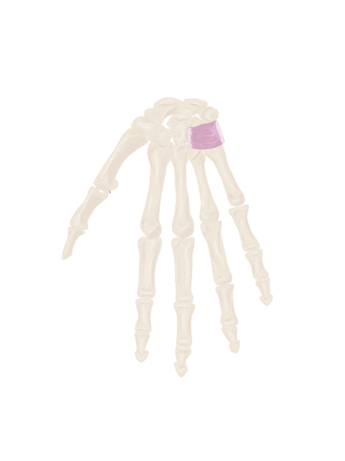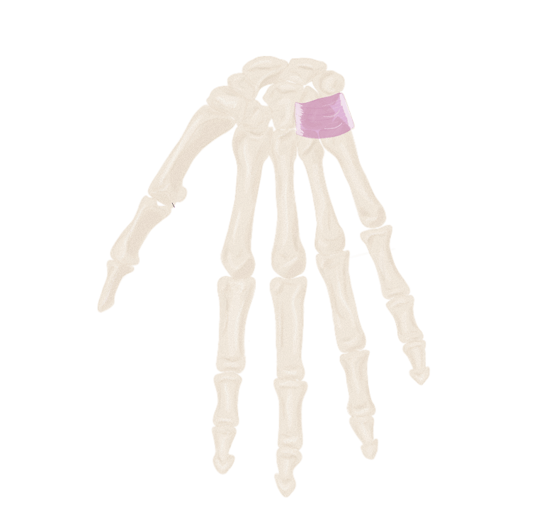 ½ ventrale de la face LAT des métacarpiens situés le plus loin de l’axe du 3ᵉ doigt, sur tous les métacarpiens sauf le III