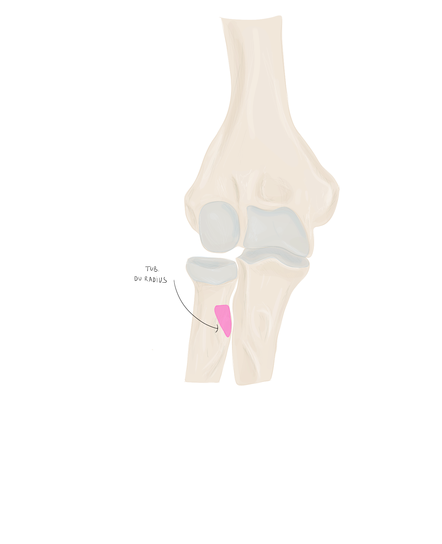 Faisceau profond se termine sur la face postéro-latérale du col du radius, en arrière de la terminaison du chef superficiel.