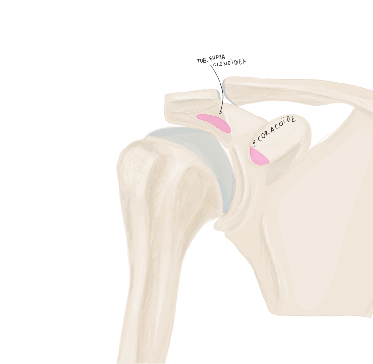 en haut : processus coracoïde, bourse sous coracoïdienne