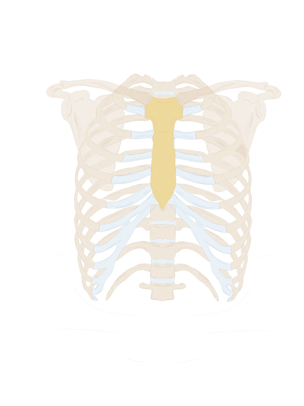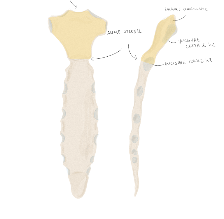 les premiers cartilages costaux sont fusionnés de chaque côté au bord latéral du manubrium : c’est la synchondrose sterno-costale de la 1ère côte.