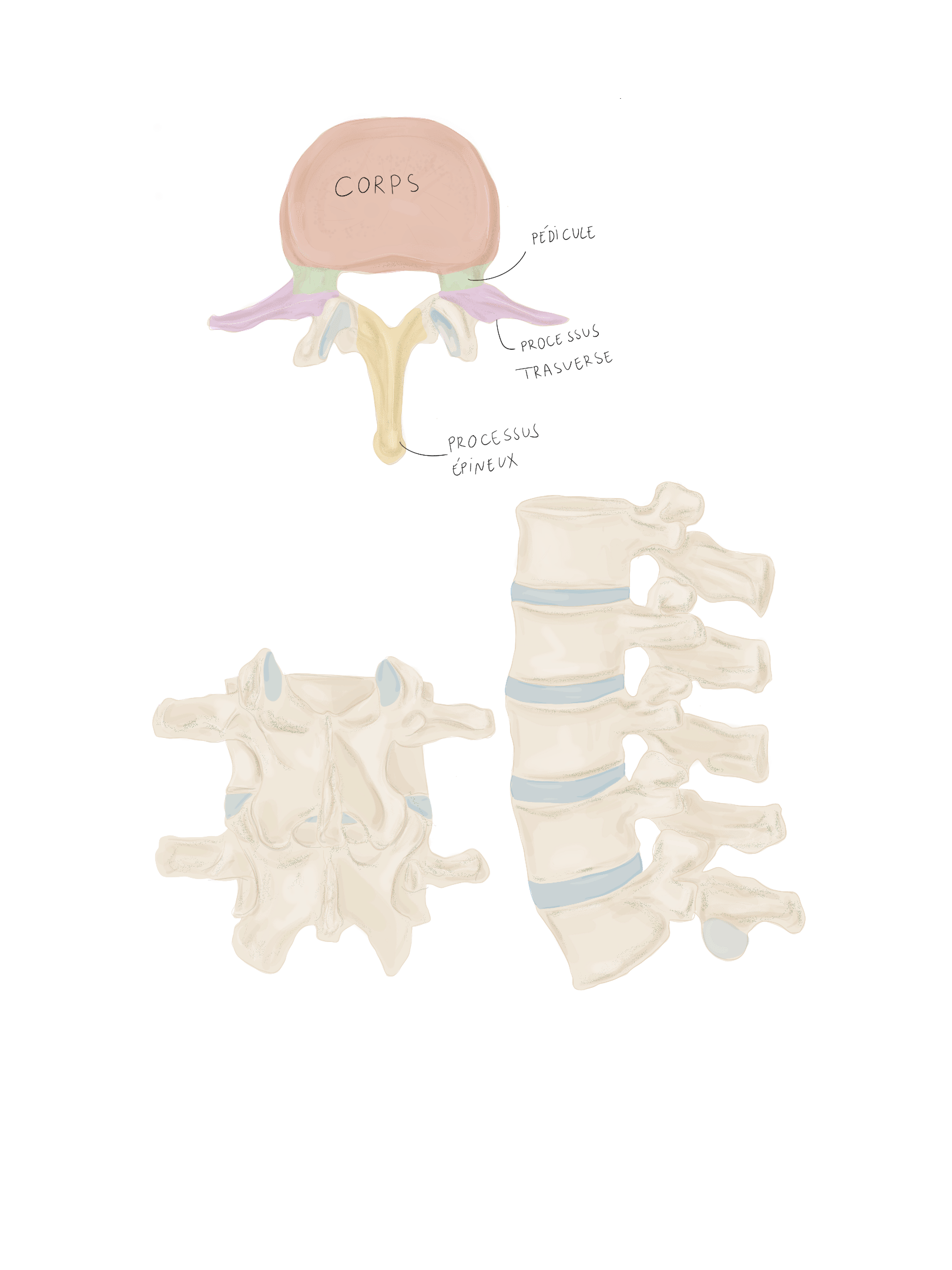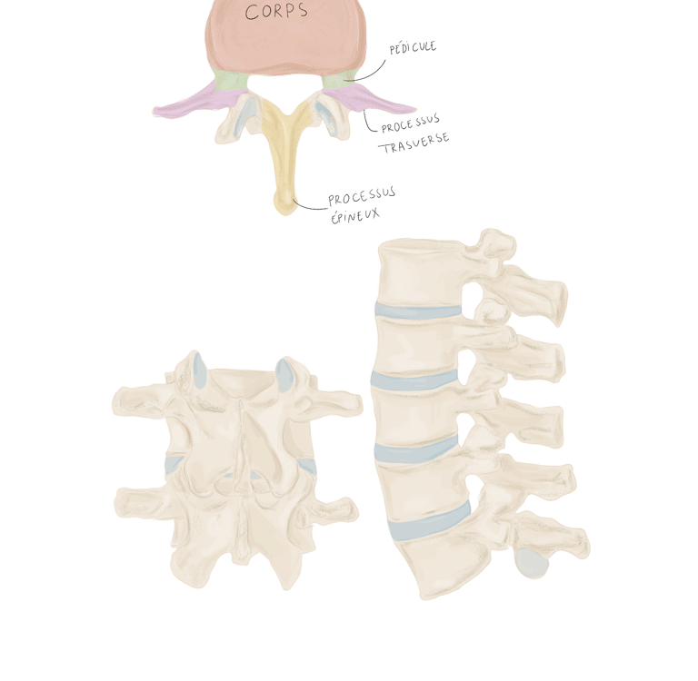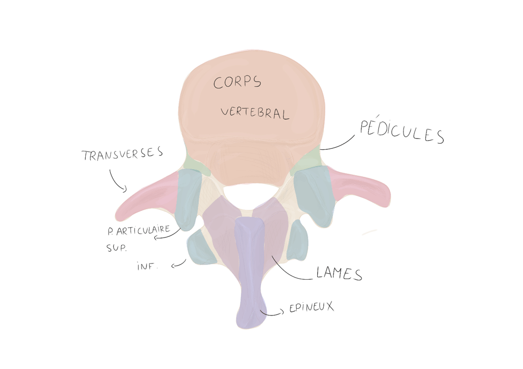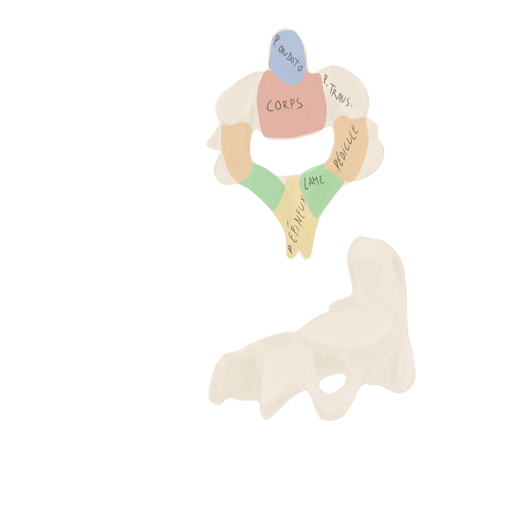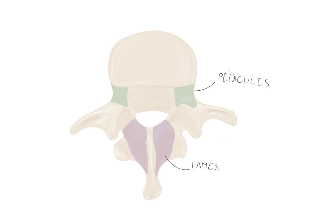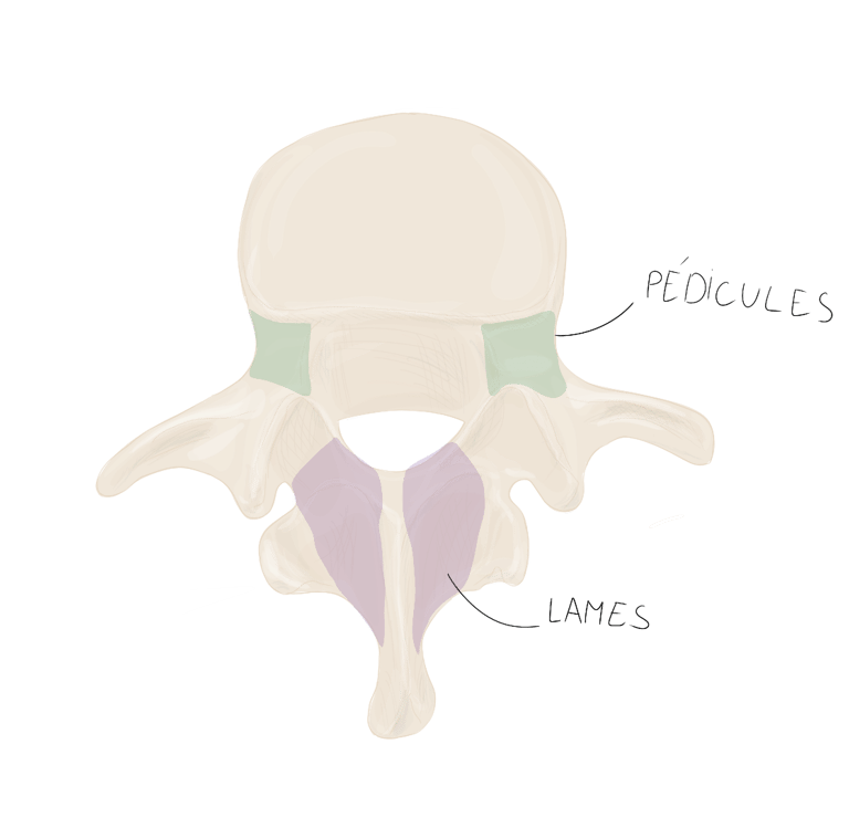 Pédicules vertébraux : droit et gauche, sont des processus vertébraux court et robustes qui unissent l'arc vertébral au corps vertébral