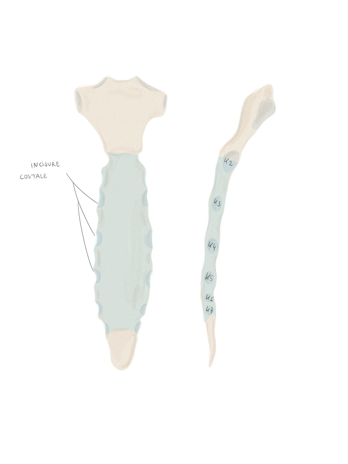 son corps se rapproche plus de celui d’une côte typique, moins incurvée et nettement plus longue que la 1ʳᵉ côte ;
