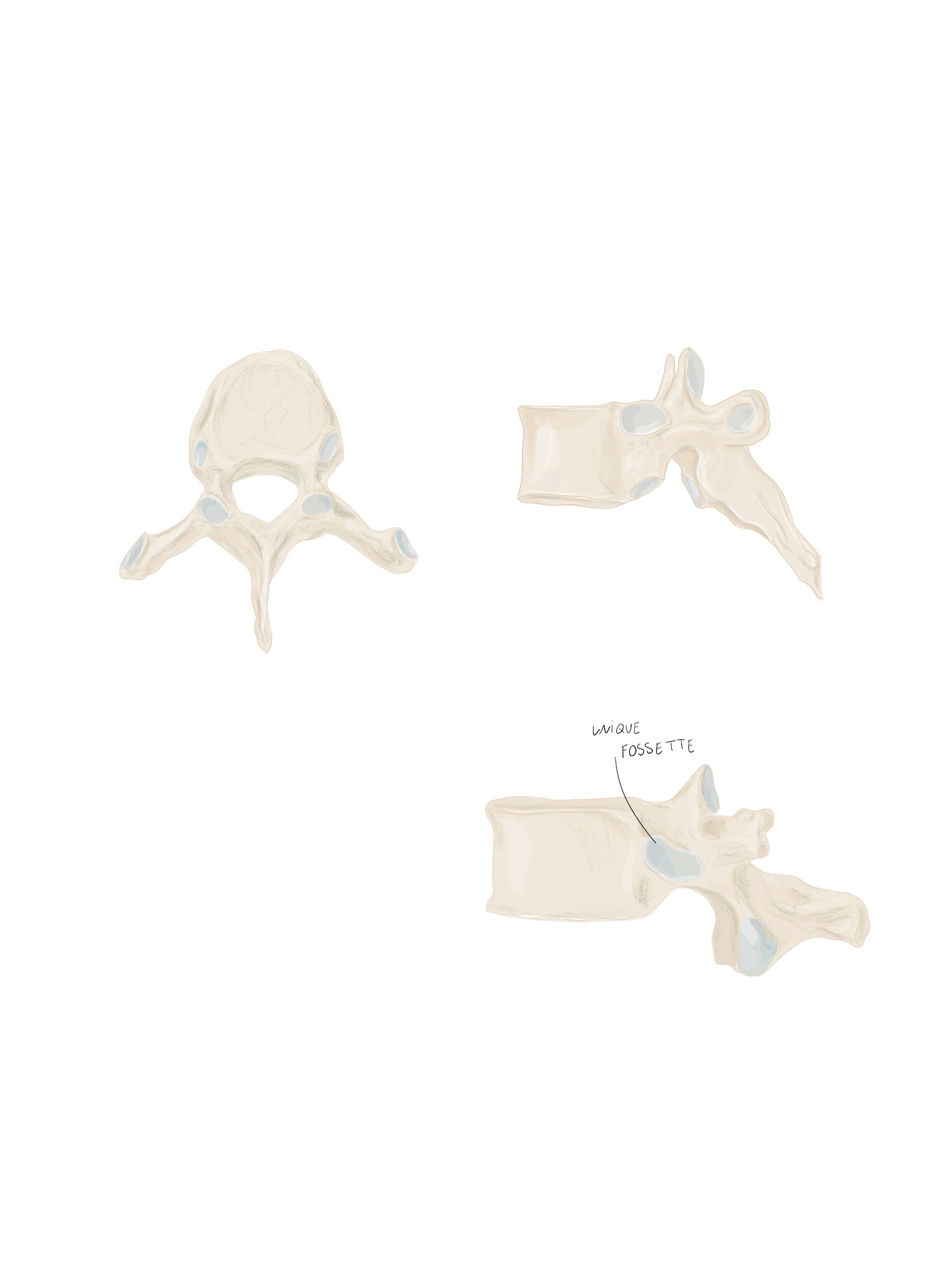 Comme la 1ʳᵉ côte, les 10ᵉ, 11ᵉ et 12ᵉ côtes n’ont qu’une seule facette articulaire sur leur tête.