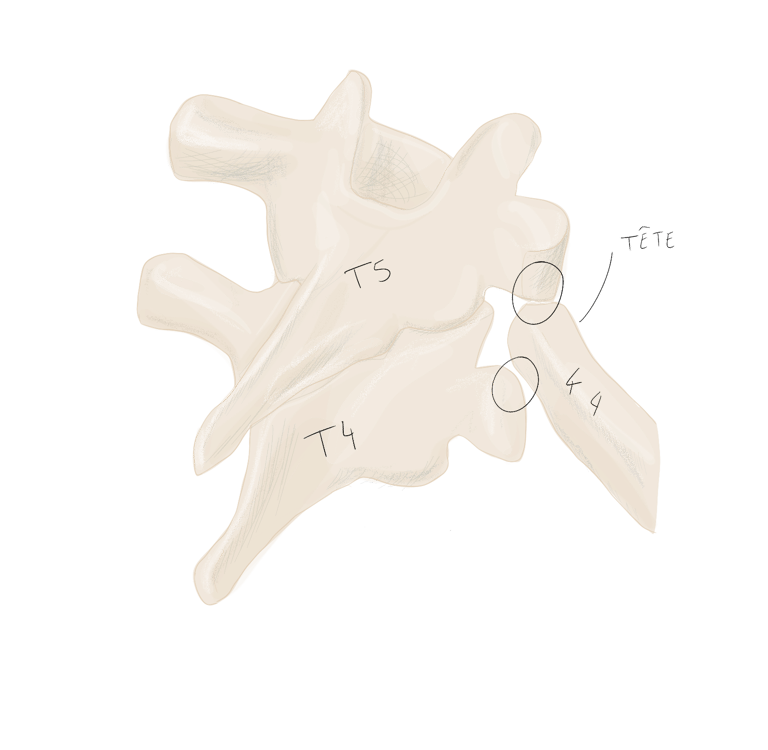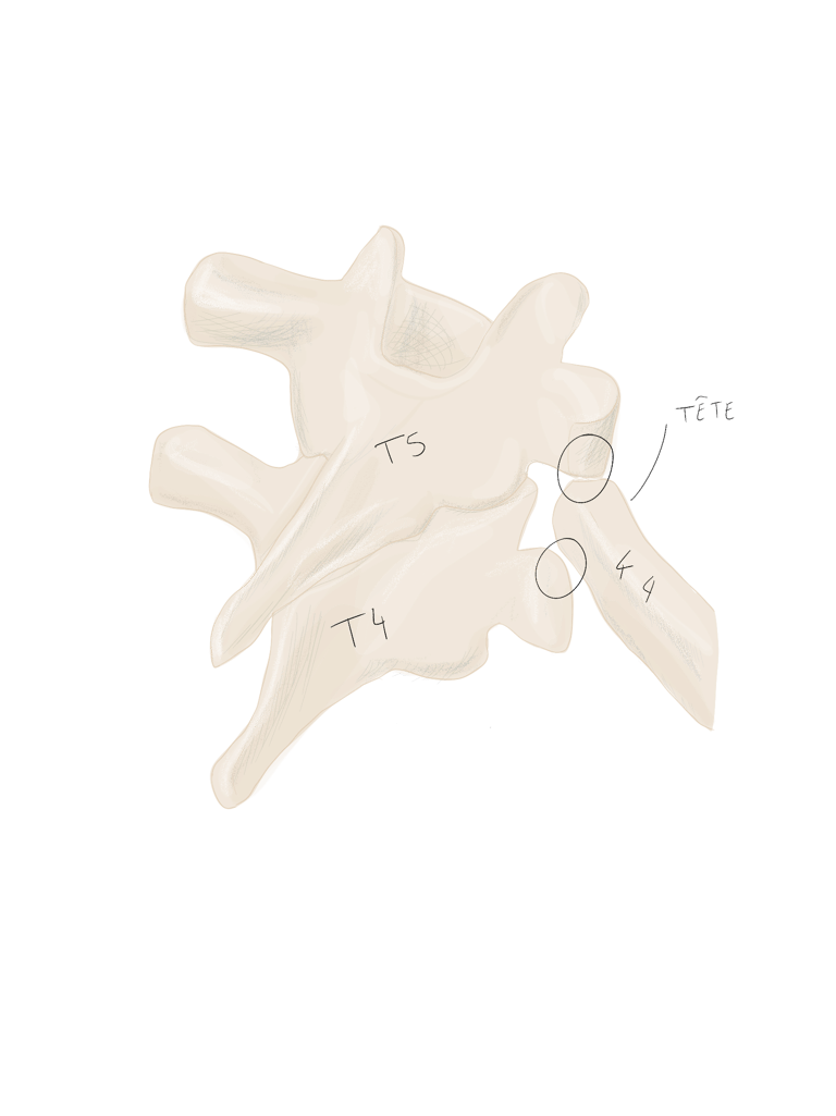 sa tête porte deux facettes articulaires pour les corps des vertèbres T1 et T2