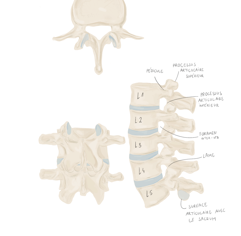 En vue supérieure : le foramen vtb varie de forme ovale ( L1) à triangulaire (L5)