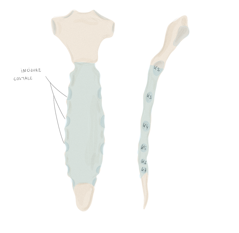 Sa largeur varie et ses bords latéraux apparaissent festonné par la présence des incisures costales