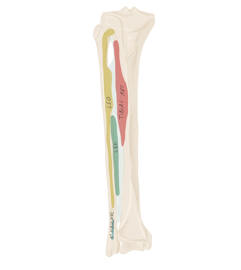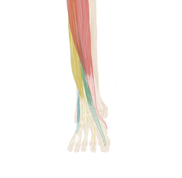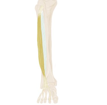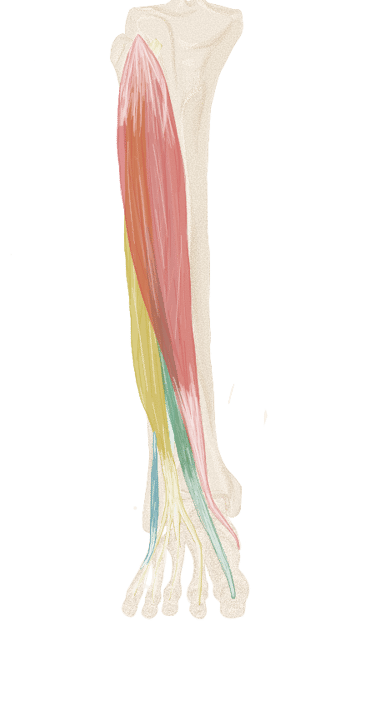 Chaque tendon va se diviser en 2 bandelettes qui contournent le tendon du long fléchisseur des orteils correspondant.
