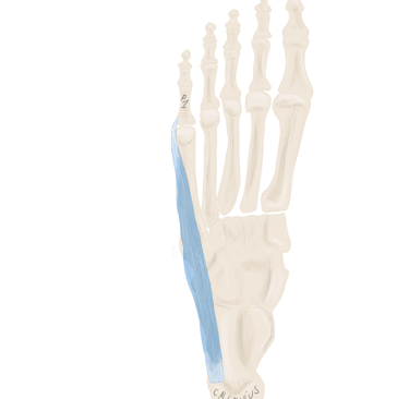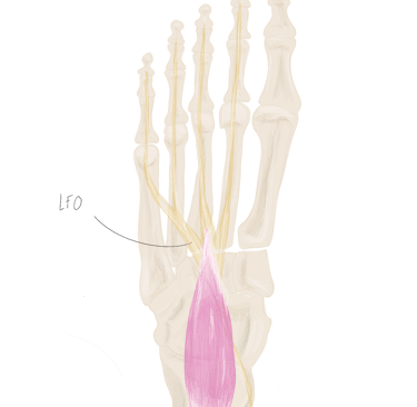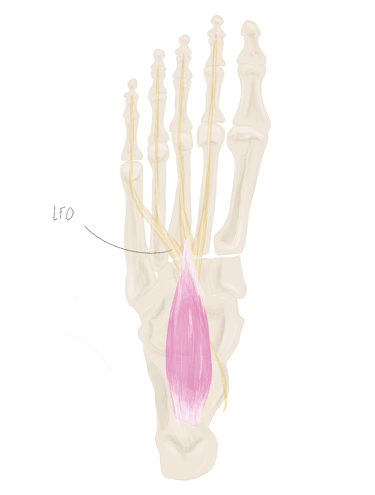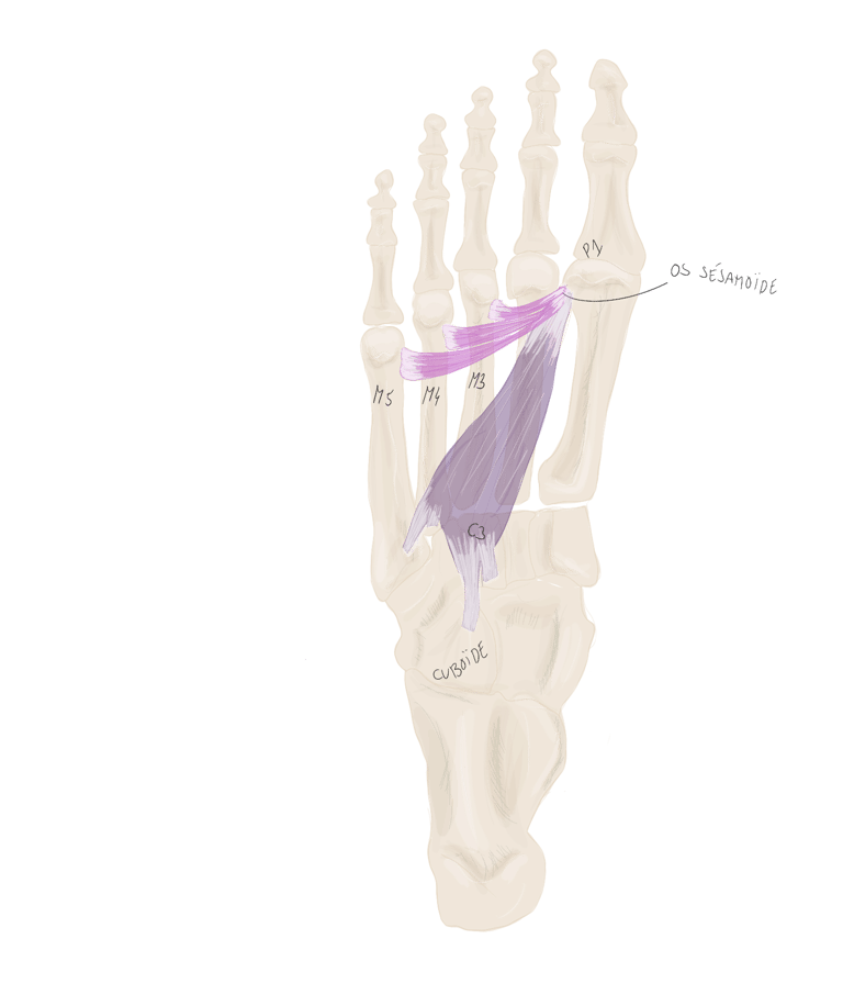 En dedans de lui se trouve l’adducteur oblique de l’hallux et en dehors de lui se trouve l’opposant du 5.