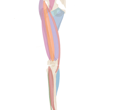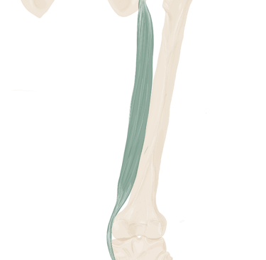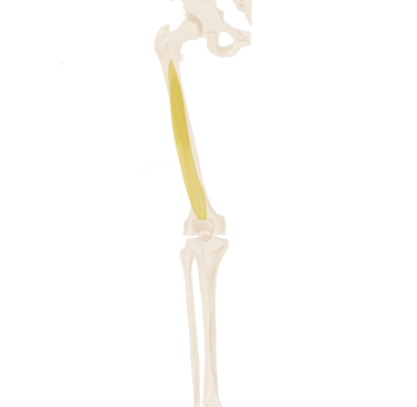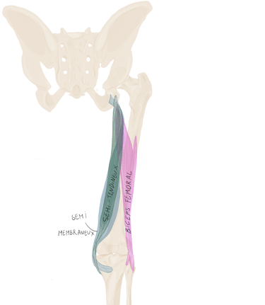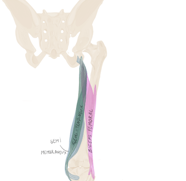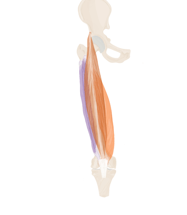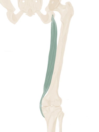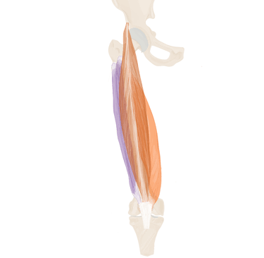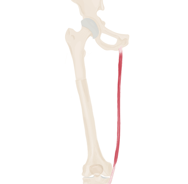 A ce niveau, il sera accompagné à son bord supérieur par le muscle jumeau supérieur et à son bord inférieur par le muscle jumeau inférieur.