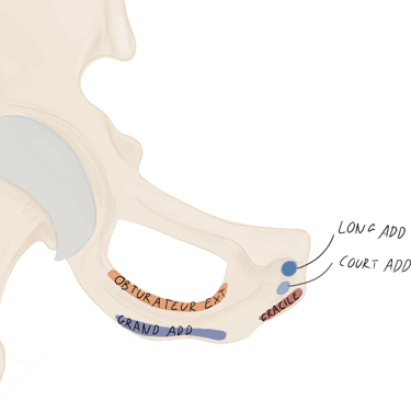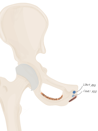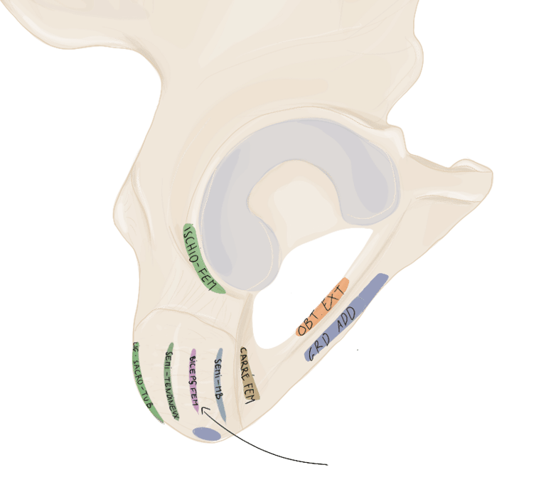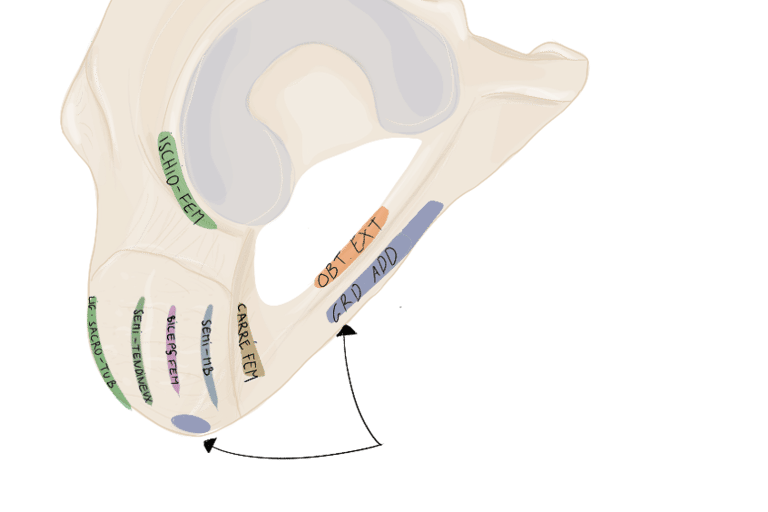 En arrière de lui se trouvera le muscle obturateur externe et en avant de lui le ligament ischio-fémoral.