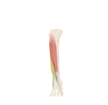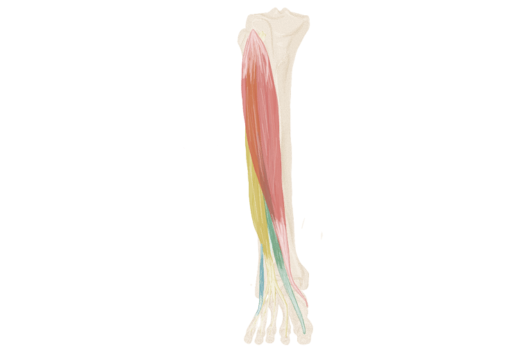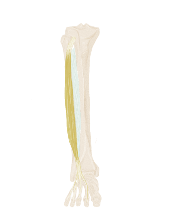 A la partie moyenne du pied, il se divise en 4 tendons.