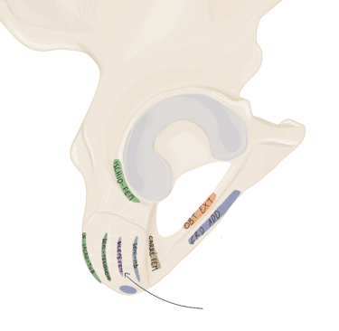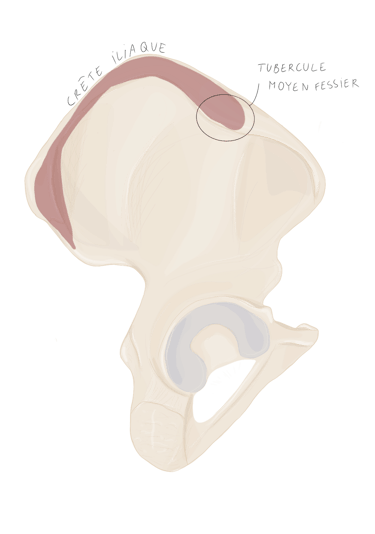 les ¾ antérieurs de la crête iliaque et notamment sur le tubercule du moyen fessier