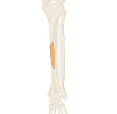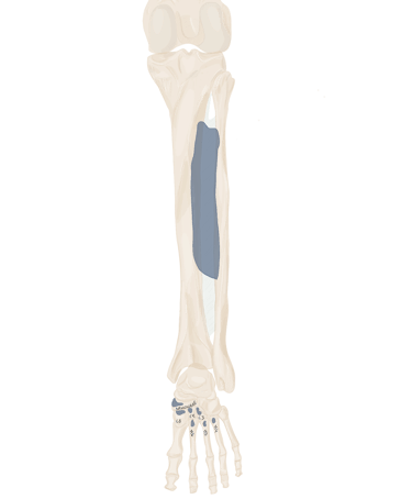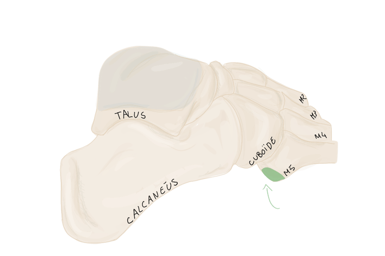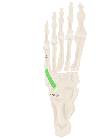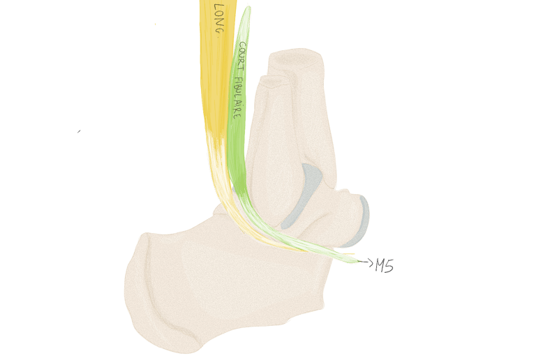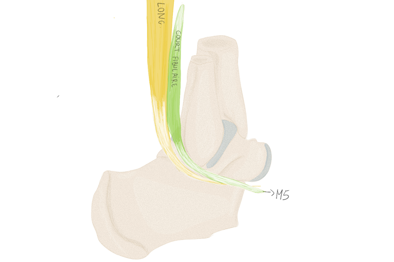 Sur la face périphérique de P1 la plus éloignée de l’axe du pied. Se termine sur P1 du 3, 4 et 5.