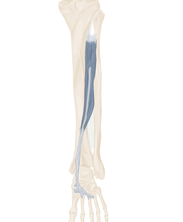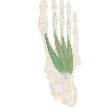 Il se continue par un tendon qui se situe en dedans de l’articulation métatarso-phalangienne des 4 derniers orteils.