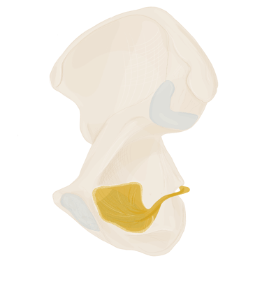 En dessous de lui se trouve le repli falciforme du ligament sacro-tubérositaire