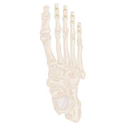 Sur la face médiale de la base de P1 des 4 derniers orteils + expansions aux tendons du long extenseur des orteils correspondant.