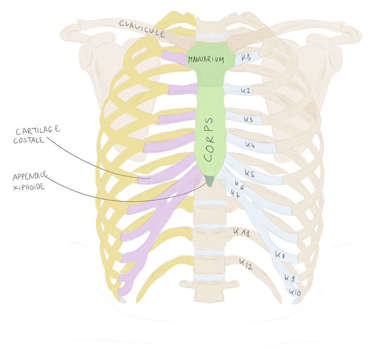 les premiers cartilages costaux sont fusionnés de chaque côté au bord latéral du manubrium : c’est la synchondrose sterno-costale de la 1ère côte.